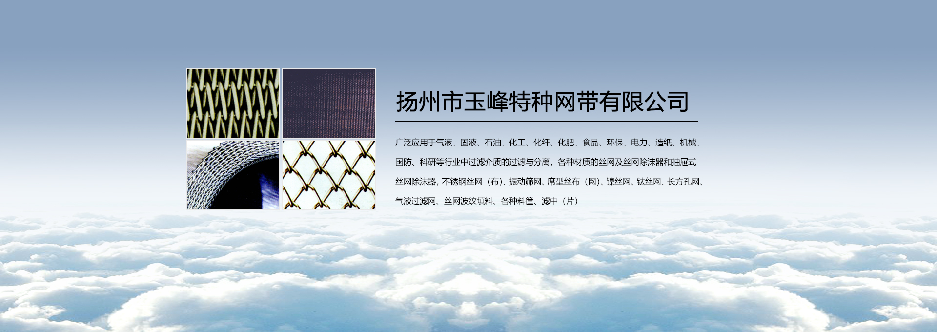 扬州市玉峰特种网带有限公司(原扬州市玉峰特种网带厂),是生产镍丝网和各类金属网带及丝网除沫器、电弧等离子喷涂加工的专业厂家。本厂采用国产进口优质线材(cr13-17、304、304L、321、316、316L、cr25Ni20siz、cr20Ni80、Sus310s、Sus314s、Ns-80、镍丝等材质)生产输送网带及丝网除沫器、玉峰网带,广泛应用于金属热处理、粉末冶金、玻璃器皿、轴承标准件、五金制品、用于淬火、清洗、渗碳、提升、干燥、烘干、固化、固熔、烧结、钎焊、覆铜、焙烧、用于环保、纺织、石油化纤工业、...